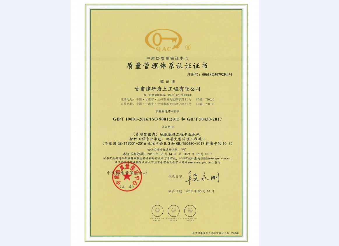 甘肃建研岩土工程有限公司《质量管理体系认证证书》
