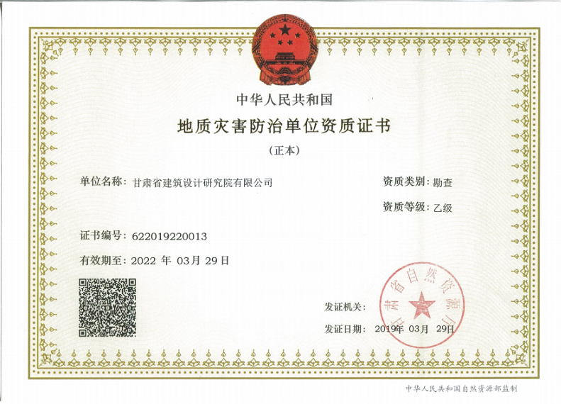 甘肃省建筑设计研究院有限公司《地质灾害防治单位资质乙级证书》