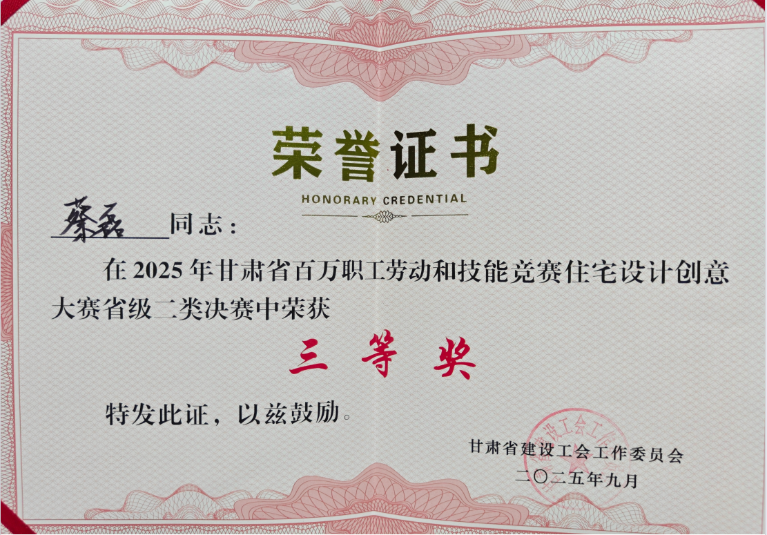 近日,由甘肃省建设工会工作委员会主办,甘肃省勘察设计协会承办,甘肃工程咨询集团工会、甘肃省城乡规划设计研究院有限公司协办的2025年甘肃省百万职工劳动和技能竞赛住宅设计创意大赛省级二类决赛在兰州落下帷幕。最终省建筑设计院选派的四名参赛选手斩获佳绩,其中,设计一院姚八依获得二等奖,设计一院邢润婷、潘德强、设计二院蔡磊分别获得三等奖,省建筑设计院获得优秀组织奖。
